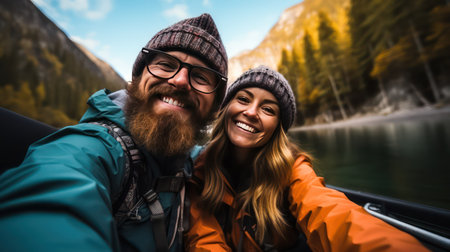 Happy couple taking a selfie in a kayak on a mountain lake