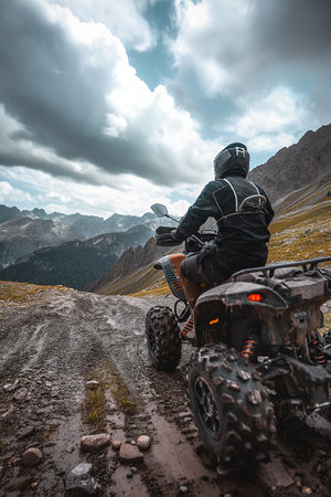 A young man is wearing a black helmet and jacket and is looking down at the ground. Concept of adventure and determination as the young man navigates the rocky terrain