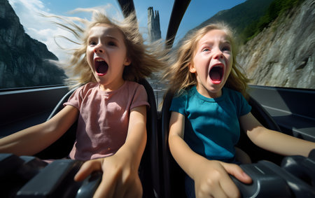 Back view of two young women driving a car in the forest.