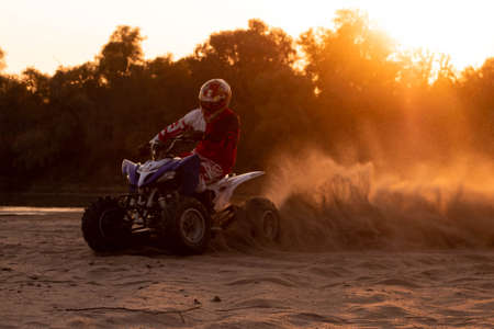Motorcyclist riding off-road through desert terrain at high speed creating dust cloud. a young man riding an electric dirt bike in the desert. Motocross rider speeds through desert sand, dust cloud during a sunset.