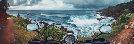 Motorcycle parked on coastal road with ocean waves crashing. Perfect scenery for travel agency and tours. Coastal path with trees lining shoreline. Ideal image for adventure seekers and nature lovers.