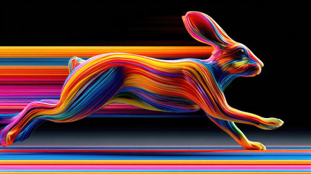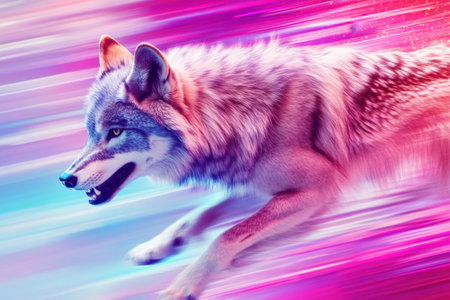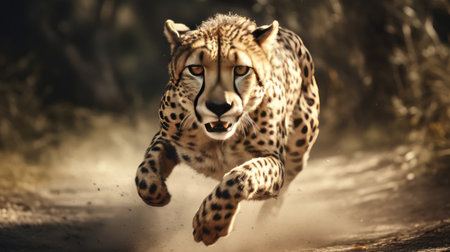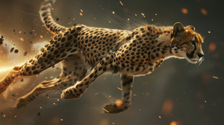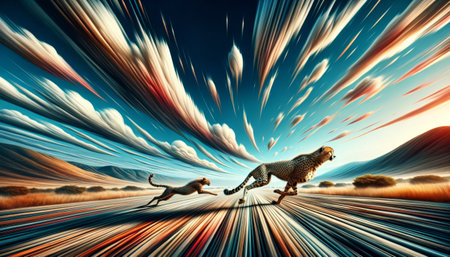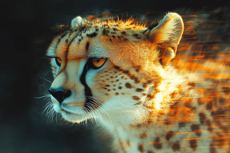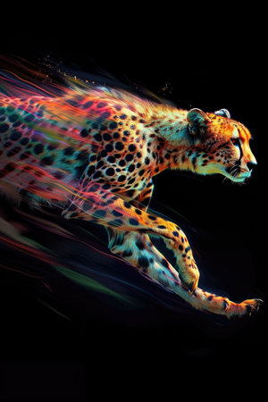 A cheetah is depicted in full stride, demonstrating speed and movement. The image showcases a blend of colors and textures, conveying a sense of energy. The composition uses blurred streaks to emphasize motion. This image could be suitable for various commercial and editorial applications that require dynamic imagery.