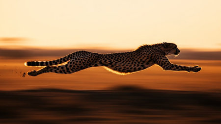 A cheetah in full sprint, silhouetted against a warm sunset with motion blur. Clear details and vibrant colors...