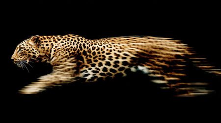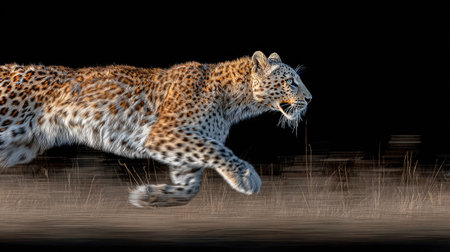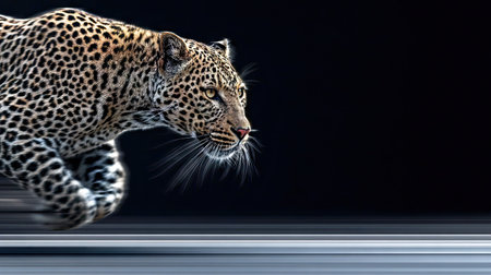 A leopard, captured in mid-stride, is the focal point of this image, set against a stark black backdrop. Its coat exhibits detailed spots and textures, enhanced by the lighting. The composition suggests motion and potential for visual storytelling, making it suitable for a variety of commercial and illustrative applications.