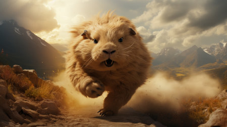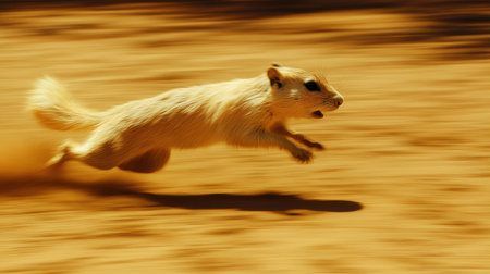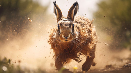 A captivating wildlife scene showcasing a small animal in mid-sprint on a dirt surface, sending up clouds of soil against a lush green background.