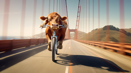 Cow riding a bike on the bridge in San Francisco, California, USA