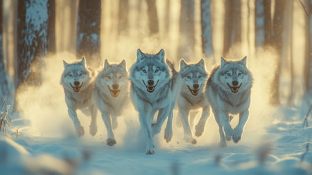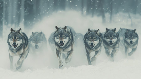 Pack of wolves sprints energetically through deep snow in a forest setting. Snowflakes fall gently as the wolves blend into their wintry surroundings, showing their natural behavior.