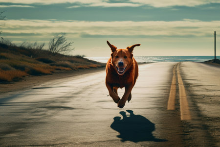 A red dog runs along an asphalt road. Pets.