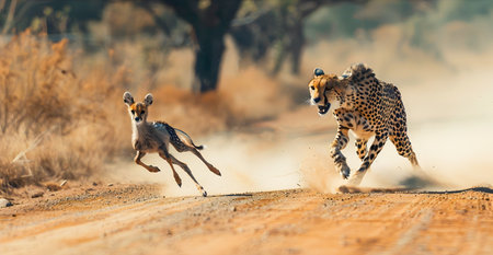 A lion sprinting after a gazelle in a dramatic display of nature. Concept Wildlife Photography, Animal Behavior, Nature in Action, Predatory Instincts
