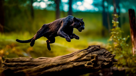 Black cat is jumping over log in the middle of the forest. Generative AI.