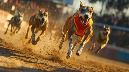 Greyhounds Racing on Track, Dynamic Action Shot with Motion Blur and Late Afternoon Sunlight.