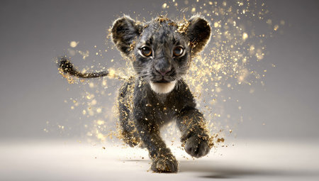 Running lion in a motion blur action style with the head in focus, generative AI illustration