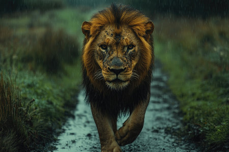 Powerful male lion walking under heavy rain in natural environment