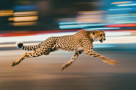 A fast cheetah dashes across city with motion blur, blending wildlife speed with urban chaos and surreal energy.