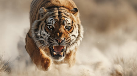 Fierce bengal tiger charging through dust in natural habitat.