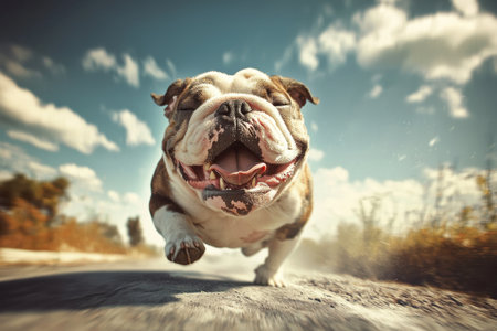 A muscular bulldog joyfully charges forward on a race track, showcasing its strength and playful spirit. The image captures an energetic and fun outdoor scene.