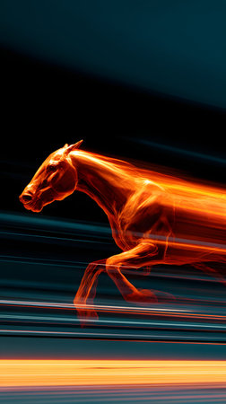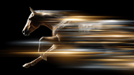 Running horse on a black background with motion blur effect. Collage.