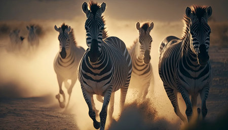 An AI generated illustration of awe-inspiring four zebras galloping across a dirt road at sunset