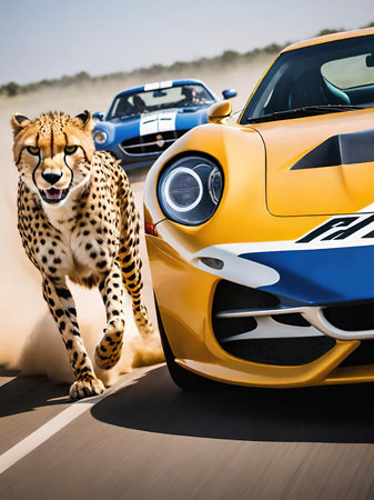 Cheetah in front of a racing car in the desert.