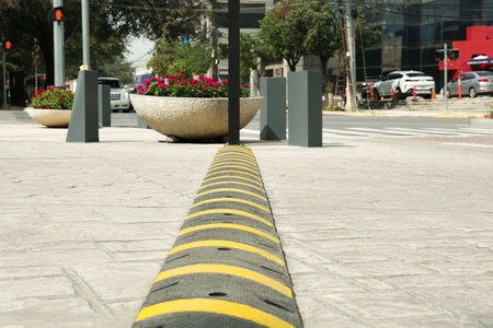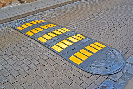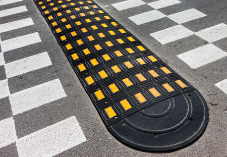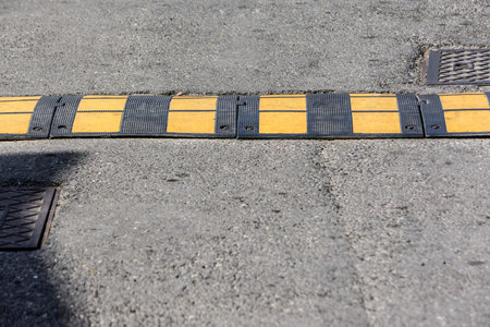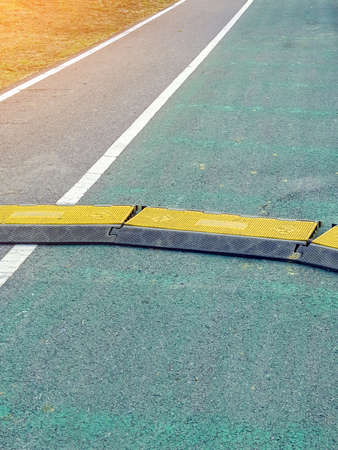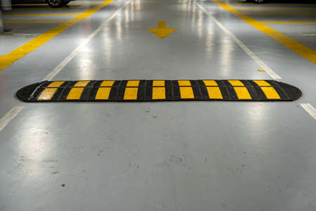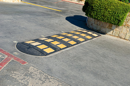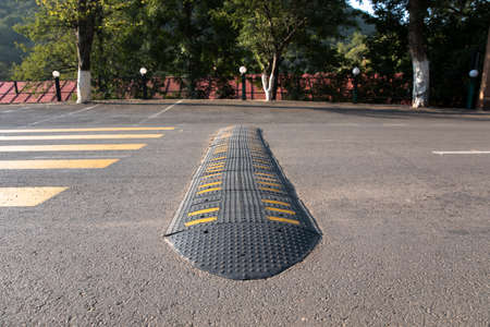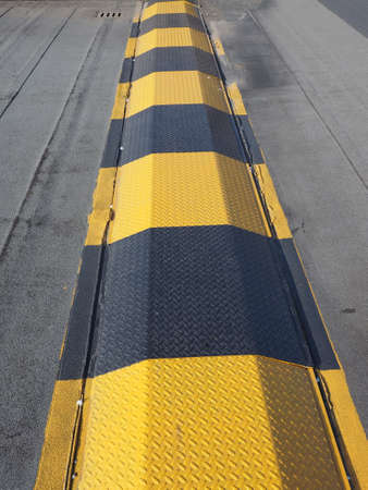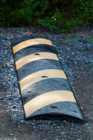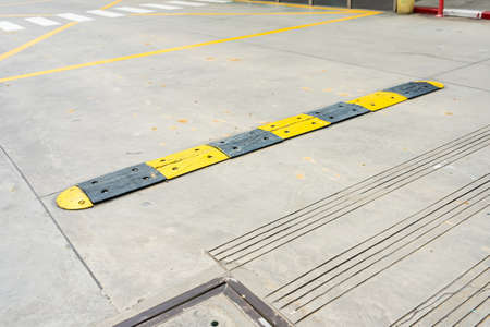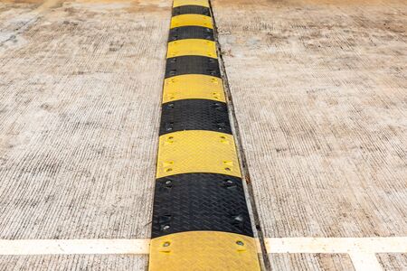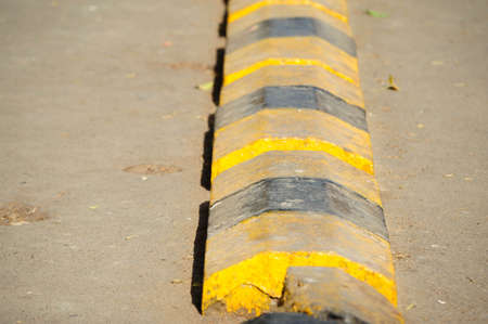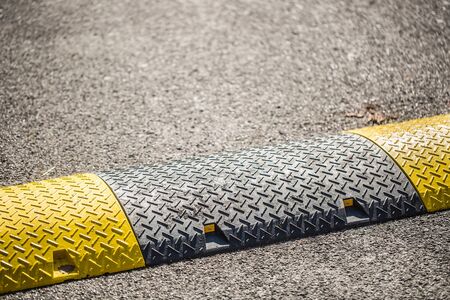 Speed bump on the road, yellow and black striped speed bump in asphalt road to slow down fast moving cars