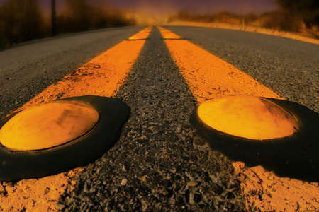 A detailed view of a paved roadway featuring vibrant yellow reflectors embedded in the asphalt, enhancing visibility and safety during nighttime driving.