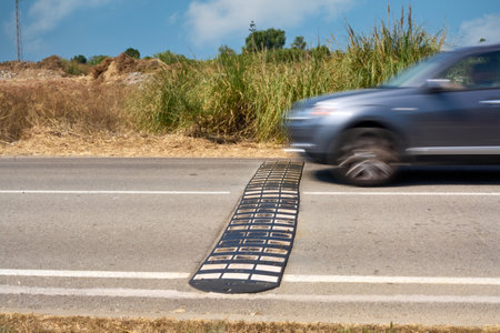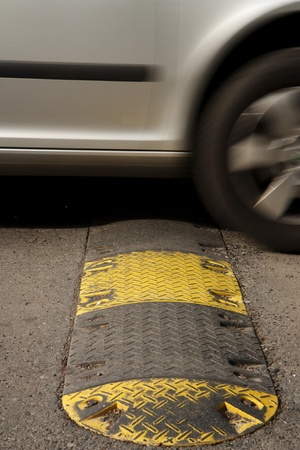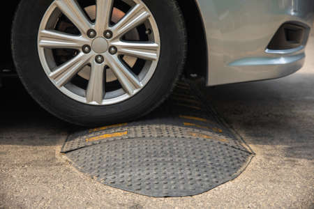 Car approaches to the traffic safety speed bump on the asphalt road.