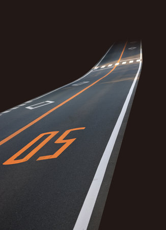 AI Generated. Curved asphalt road from a top view features smooth dark gray textures with yellow lines positioned diagonally for creative project backgrounds
