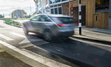 A car driving over raised speed bump and pedestrian crossing. Auckland.