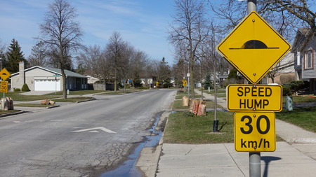 Yellow road signs indicate that speed humps are in the road and suggested maximum speed is 15 kph.Yellow road signage.Warning