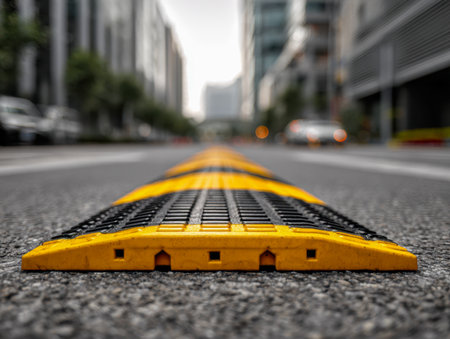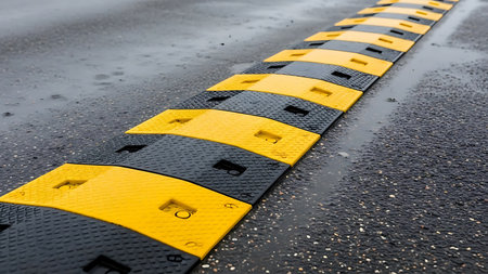 A close up view of a textured rubber speed bump with black and yellow stripes installed on an asphalt road surface to slow down vehicle traffic and ensure driver safety in residential areas.