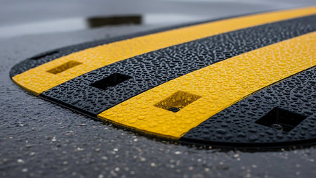 Reflective Striped speed bump on street. Control traffic warning. Generate Ai