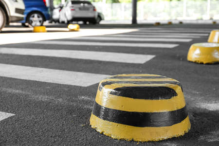 Parking limiters with yellow and black stripes on parking lot under canopy