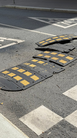 Damaged speed bump on asphalt road with yellow markings for traffic safety background. Mobile photo