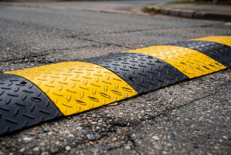 A close up view of a textured rubber speed bump with black and yellow stripes installed on an asphalt road surface to slow down vehicle traffic and ensure driver safety in residential areas.