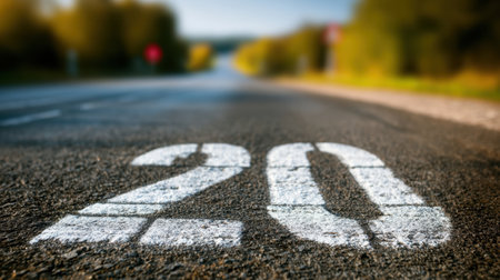 This close-up image features a vibrant yellow number twenty painted on an asphalt road, showcasing detailed texture and a clear perspective on urban signage.
