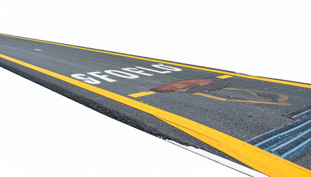 An isolated segment of an asphalt airport road with yellow lines and SFO markings, set against a clean white background.