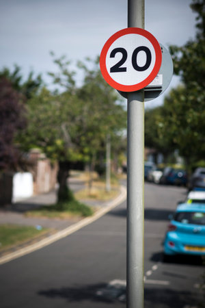 Twenty miles per hour speed limit sigh on the road in Hampstead, Borough of Camden, London, UK.