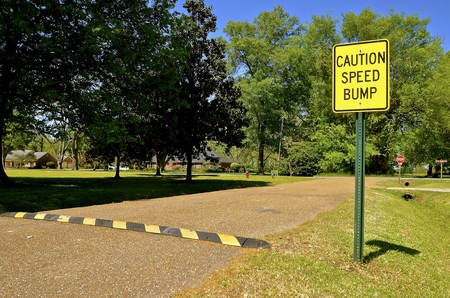 A speed bump warns motorists in a small town street