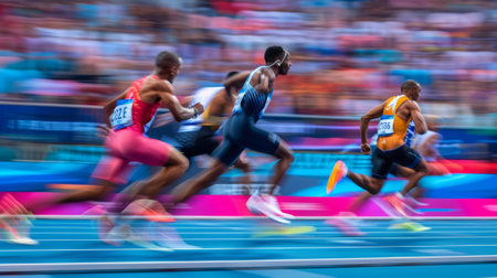 Vivid Scene of Male Athletes Speeding in a Sprint Race with Powerful Motion Blur Effect.