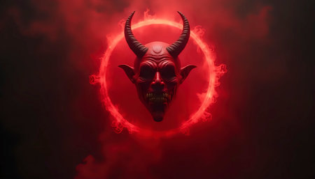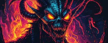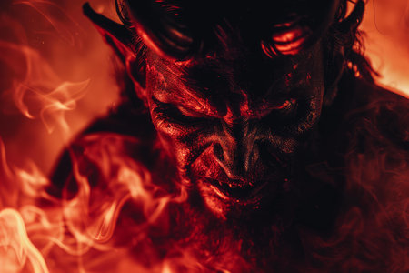 Closeup of a demon face enveloped in intense red flames, depicting evil