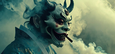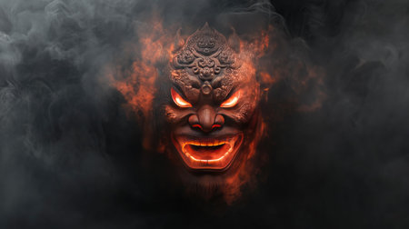 A striking traditional mask emerges from swirling dark smoke, featuring glowing eyes and fiery expressions that evoke emotion and intrigue.