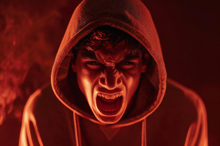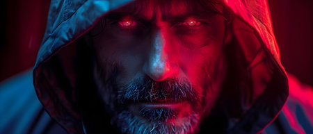 Intense close-up of a male gaze with glowing red eyes. Blazing eyes of the demon in the dark. Concept of power, supernatural, intensity, mystery.