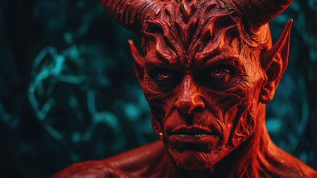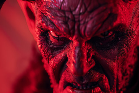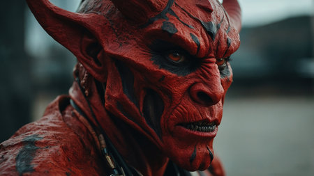 Intense closeup of a demon with detailed red skin texture, imparting a sense of horror