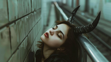 Mysterious Woman with Horns Resting in a Subway Carriage