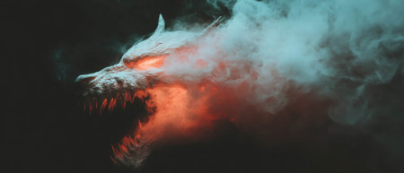 Majestic creature emerges from darkness with swirling mist and glowing features