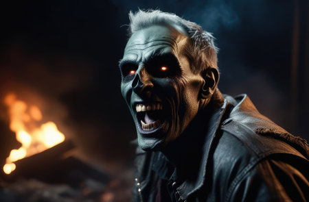 Halloween concept, horror movie scene - fiery-eyed zombie yelling in front of flames