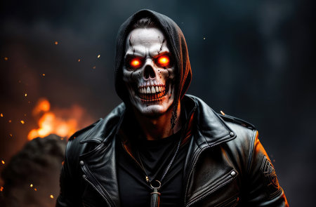 skeleton with blazing eyes yelling in front of flames. Halloween concept, horror movie scene