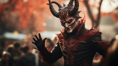 A devil character showcases detailed makeup with horns and intense eyes at a lively outdoor event surrounded by a festive atmosphere.