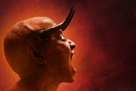infernal red demon with horns screaming in fire, horror or fantasy film scene