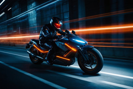 Speeding Motorcycle Rider in Illuminated Tunnel at Night.